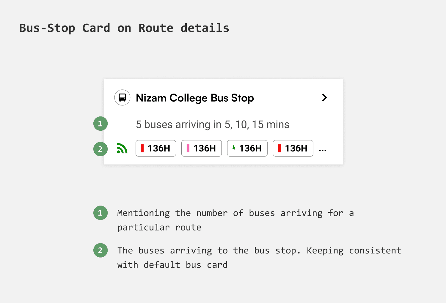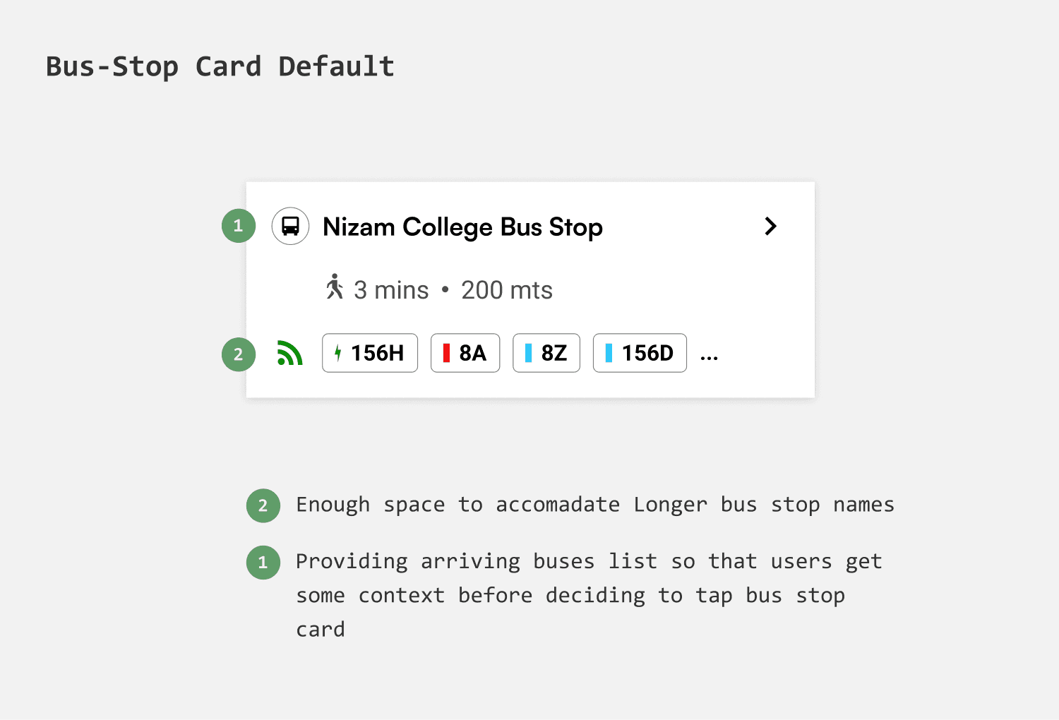 Instead of showing the buses arriving to the last stop, i decided to show nearest bus stop details at forefront so that it can help users plan their journey more efficiently.