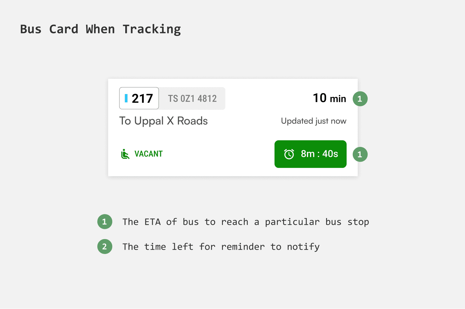 The bus card needed to be consistent throughout all the states - Before tracking, After setting reminder, During bus ride.