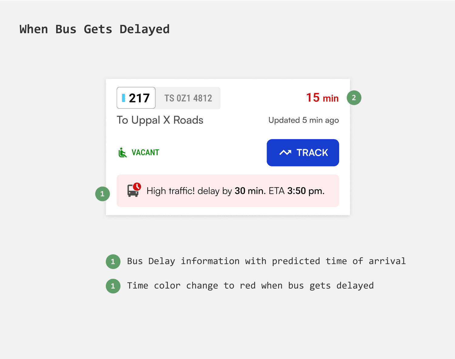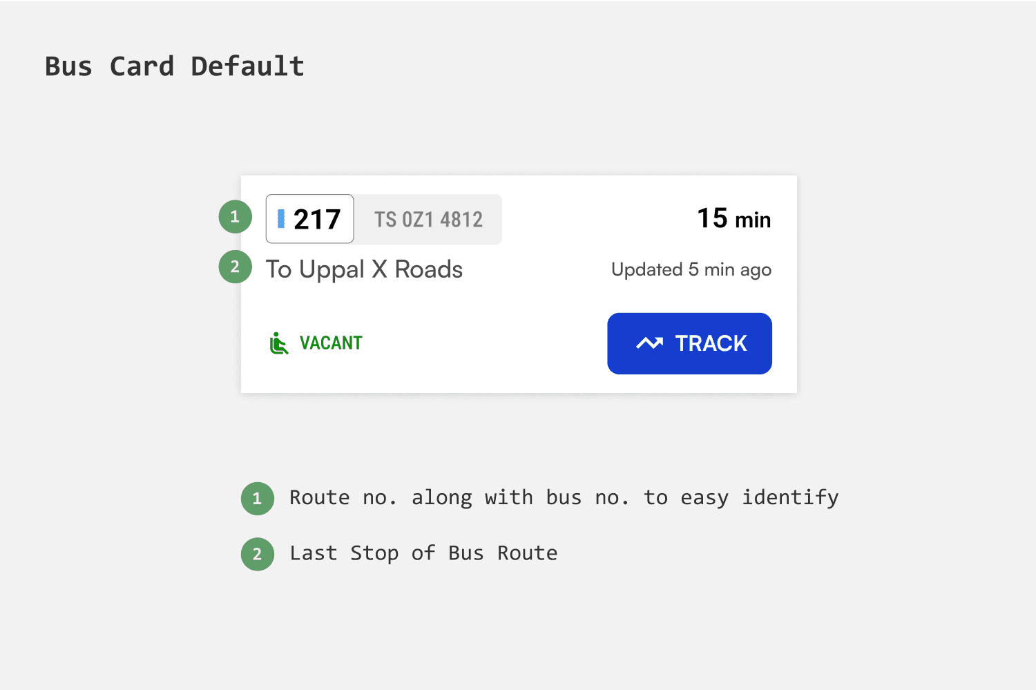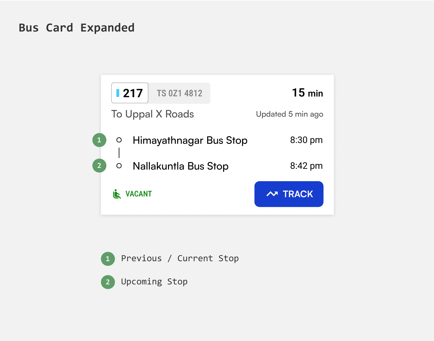 In other apps like google and chalo the live buses of a route are shown on map with upcoming buses in route progress interface. This would slow down the user in evaluating buses. So I chose a list format to show all the buses so that users can compare and track with fewer interactions.